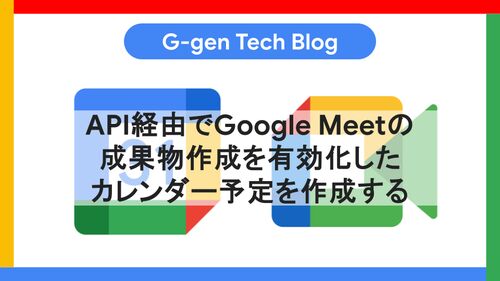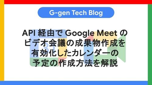 G-gen の高宮です。Google Calendar API と Google Meet REST API を利用し、Google Meet の成果物作成を有効化したカレンダーの予定を作成する方法を解説します。 はじめに 概要 Google Calendar API とは Google Meet REST API とは 免責事項 事前準備 各…