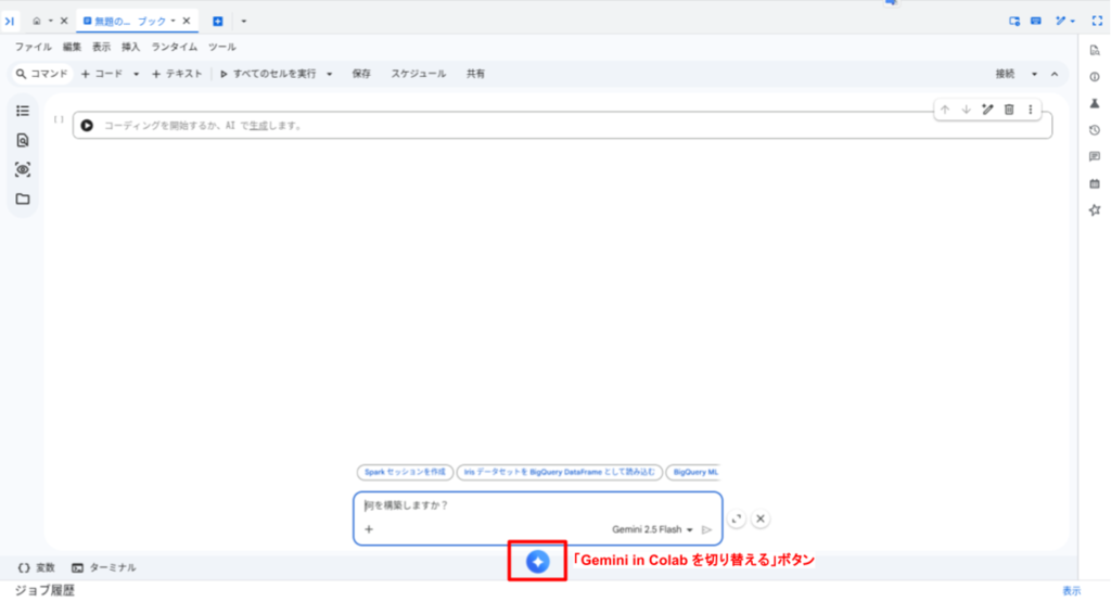 Colab Enterprise もしくは BigQuery Studio で Colab Enterprise ノートブックを開きます。画面下部にある青いボタンを押下することで、Gemini(Gemini in Colab Enterprise)のプロンプト入力を行い、データサイエンスエージェントに対して指示を与えることができます。