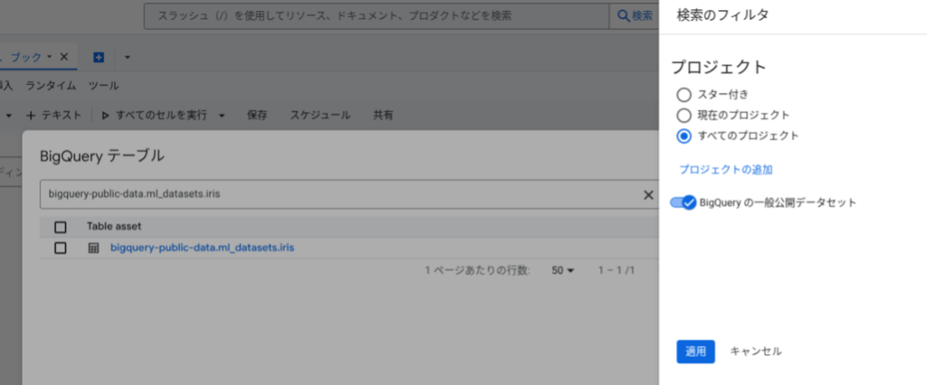 テーブルセレクタは、プロンプト入力ウィンドウにある + マークから使用することができます。検索フィルタを設定することで、他のプロジェクトや一般公開データセットのテーブルも参照できます。