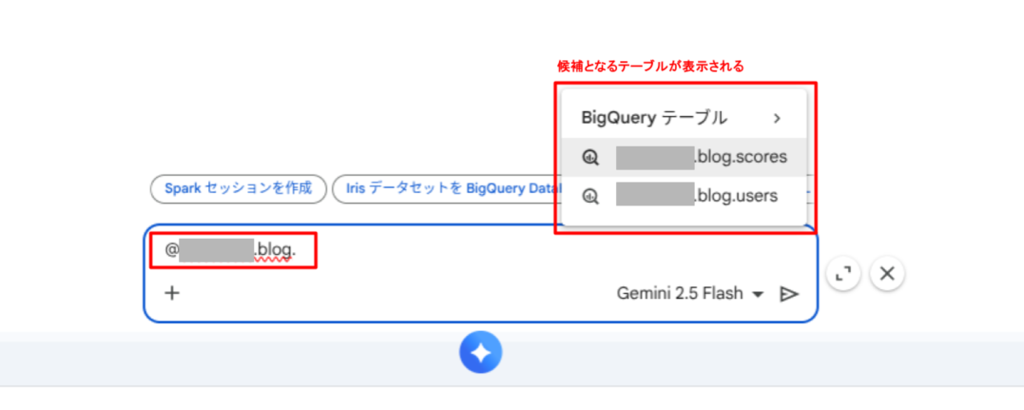 また、プロンプトに @<プロジェクトID>.<データセット名>.<テーブル名> のように記述することで BigQuery テーブルを検索することもできます。検索結果として他のプロジェクトのテーブルも表示されますが、実際に参照できるのは同じプロジェクトに存在するテーブルのみです。なお、他のプロジェクトのテーブルを指定すると無視されます。