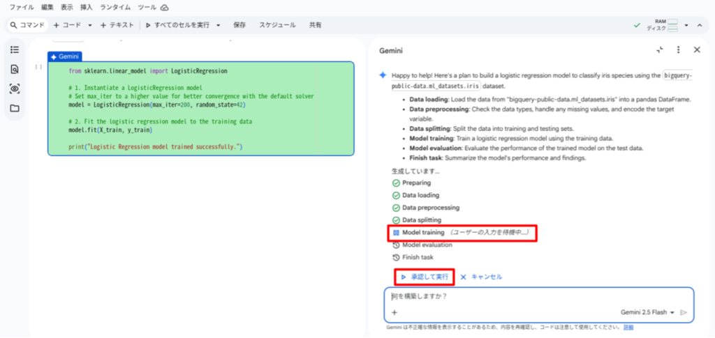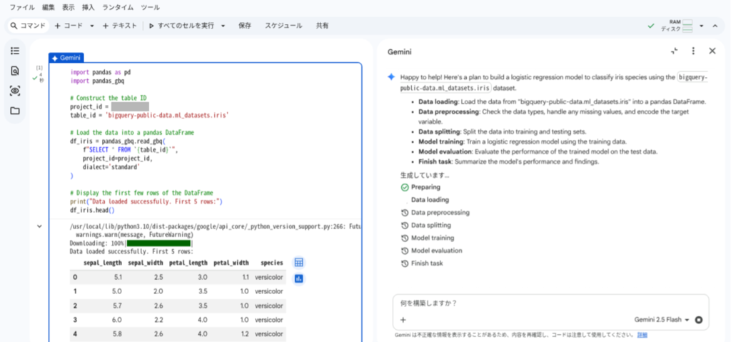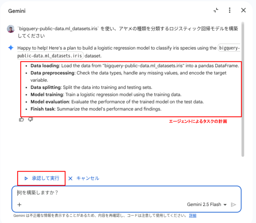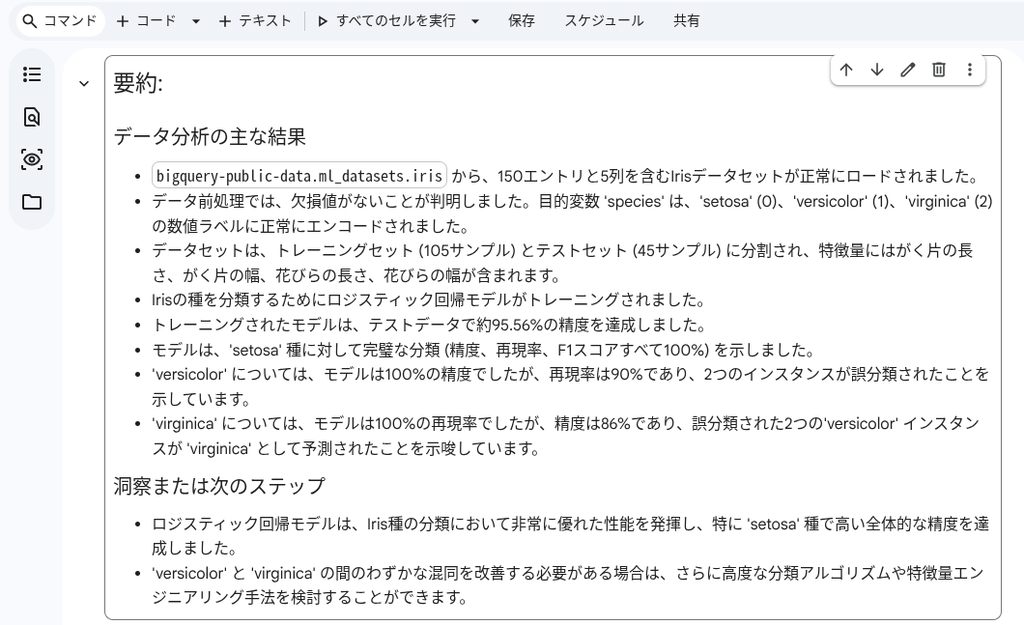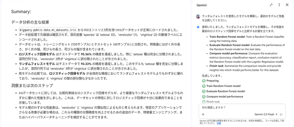 以下のプロンプトを送信して、BigQuery の一般公開データセットにある iris テーブルを使用した機械学習モデルの構築を指示します。