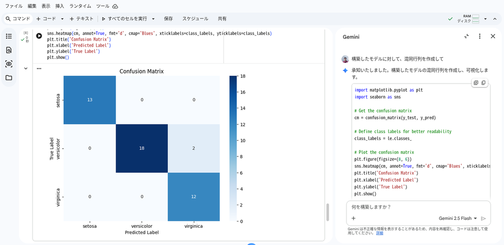 構築したモデルの評価のため、混同行列を用いた可視化を指示してみます。以下のプロンプトを送信します。