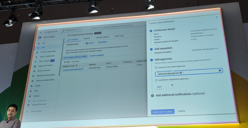 今回発表された Privileged Access Manager(デモのコンソールでは「PAM」と表示)では、権限付与を承認ベースで行うことができます。