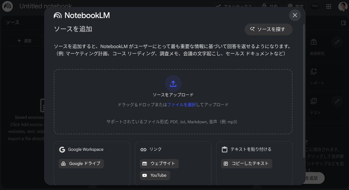 データが取り込めると、ノートブック画面が表示されます。タイトルが自動で生成されるほか、概要の文章が中央部分に表示されています。学習を進めるに当たって、さらに理解を深めたいと感じた領域については、随時、左上の「ソース」ブロックの「+ 追加」ボタンからデータソースを追加します。