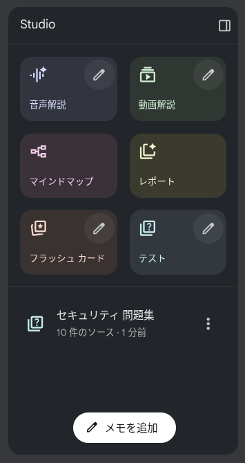 画面右側の「Studio」ブロックにある「テスト」ボタンを押下して、NotebookLM にテストを作成させます。「テスト」ボタンを押すと、数分後にテストが生成されます。
