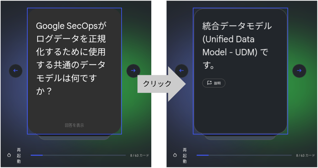 次に、画面右側の「Studio」ブロックにある「フラッシュカード」ボタンを押下して、NotebookLM にフラッシュカードを作成させます。フラッシュカードとは、学生が英単語を覚えるときに使うような、表面に質問が書いてあり、裏面に答えが書いてあるようなカードです。「フラッシュカード」ボタンを押すと、数分後に生成されます。