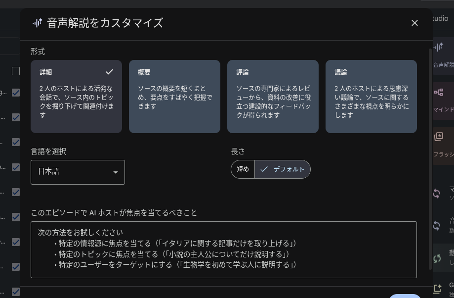 英語の音声が生成されてしまう場合には、「音声解説」ボタンの右上に表示されている鉛筆マークを押してください。ここでは出力言語が選べるほか、どのような音声を生成するか、また音声の長さなどを詳細に指定することができます。焦点を当てるトピックを自然言語で指示することもできます。