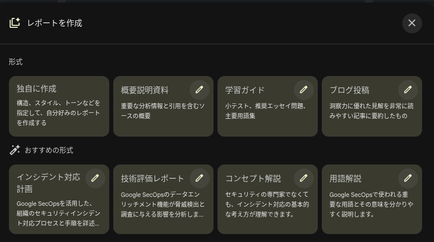 画面右側の「Studio」ブロックにある「レポート」ボタンを押下すると、どのようなレポートを生成するかの選択肢が表示されます。AI が提案する選択肢の中から1クリックで選べるほか、プロンプトで細かくテイストを指示することもできます。
