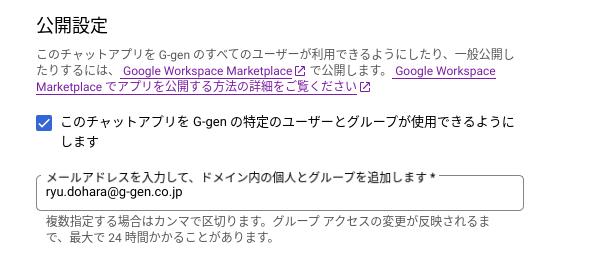 正常時、Google Chat API のコンソール画面にある「公開設定」にメールアドレスを記入することで、特定の Google アカウントまたは Google グループにチャットボットを公開するが可能です。