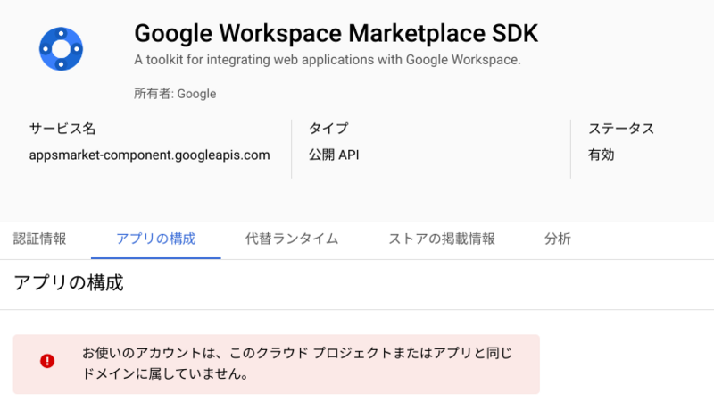 アカウント B が Google Chat API を有効化した場合、アカウント A が Google Workspace Marketplace SDK のコンソール画面にアクセスすると以下のエラーが表示されます。