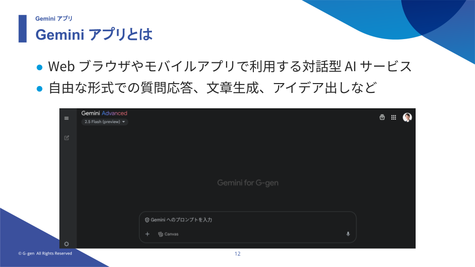Gemini アプリは、生成 AI との自然言語による対話を通じ、質問や文章の生成、要約、翻訳、ソースコードの生成など多数のタスクを行うことができます。
