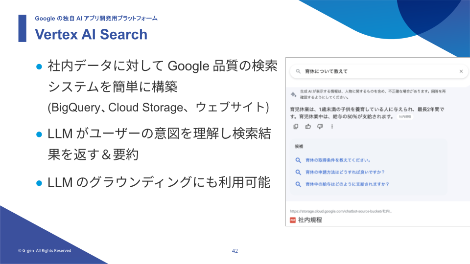 Google の Out-of-the-box な AI ツールを使う方がいいケースと、独自アプリを開発したほうがいいケース、両方のケースがあり、それらを適切に判断する判断基準を持つことが重要であるとしました。