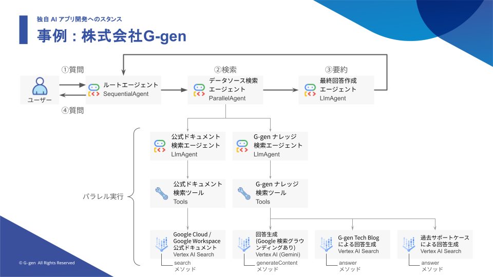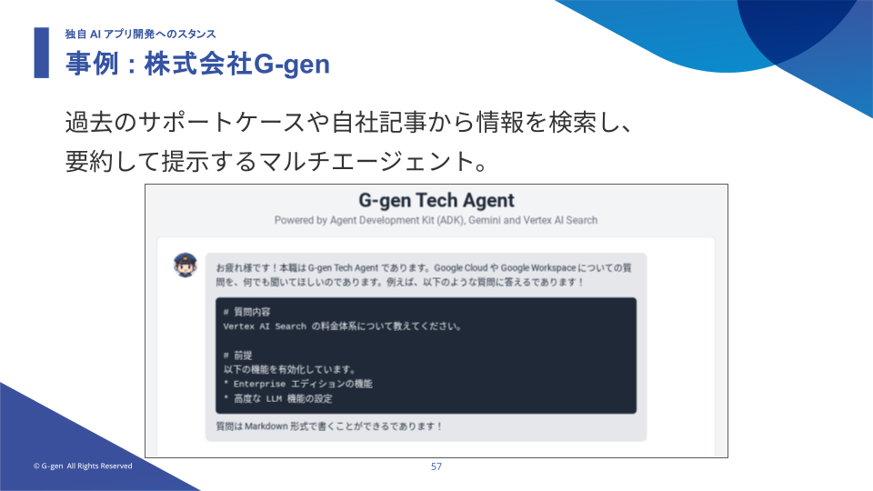 また G-gen 社の事例として、同社が提供する AI サービスである G-gen Tech Agent の事例が紹介されました。