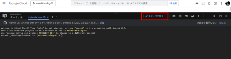 Cloud Shell とは、Google Cloud コンソール上で起動する仮想的な Linux ターミナルです。コードエディタも付属しており、Web ブラウザだけで開発を完結させることができます。以下の記事も参考にしてください。