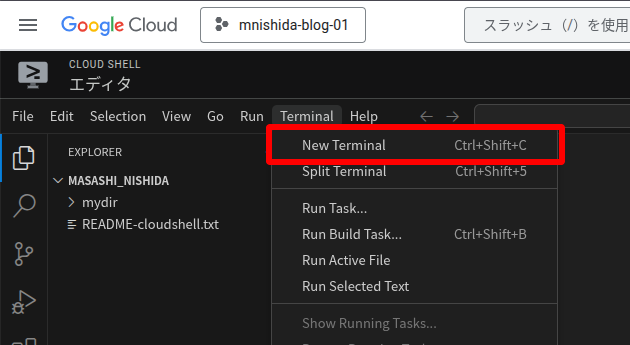 エディタ画面の左上の [Terminal] タブの中の [New Terminal] を選択します。