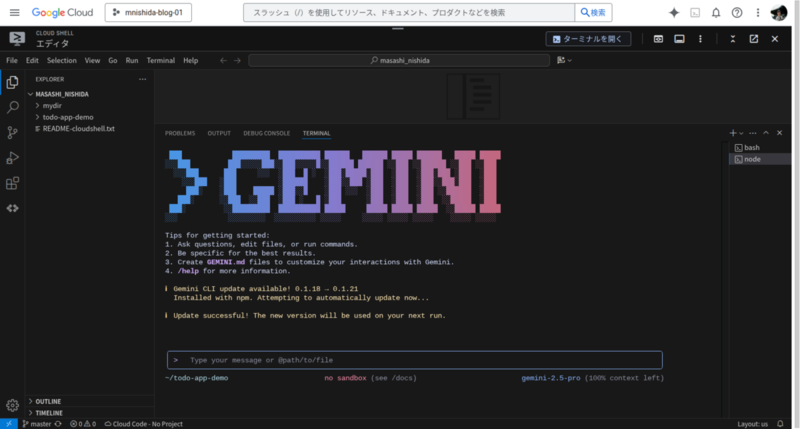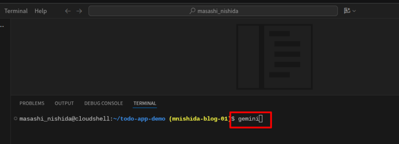 開発用ディレクトリの準備が完了したら、gemini とコマンドを入力して、Gemini CLI を起動します。