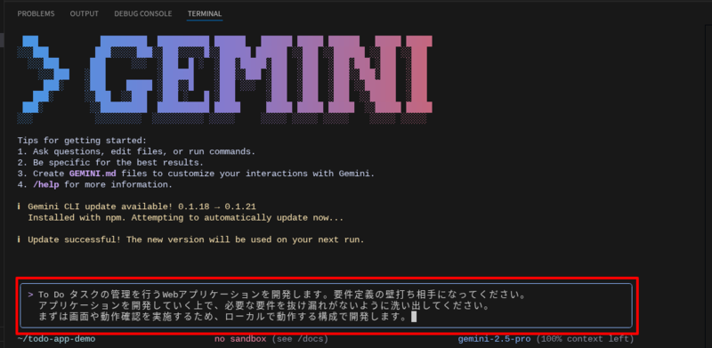 いずれのステップも Gemini に「要件定義の内容をファイルに切り出して」というような自然言語の指示を出すことで処理が実行されるので、簡単に進めることができます。