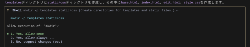 Gemini がファイルの作成や更新を実施する前には「〇〇を作成します。よろしいですか?」といったように作業内容を確認されます。 その処理内容に対するリアクションを選択肢の中から選びます。上下の矢印キーで選択肢を切り替えて、Enterを押すことで選択できます。