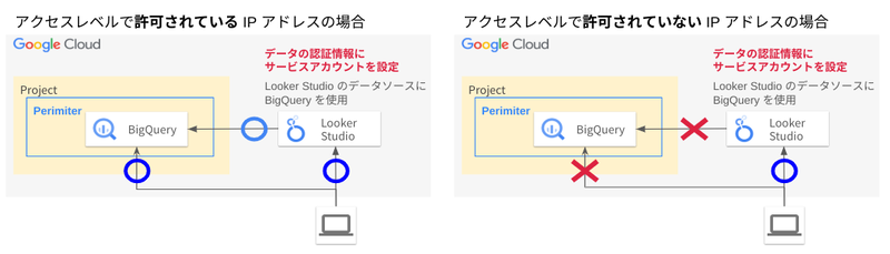当記事では、Looker Studio でデータソースに対する認証にサービスアカウントを使っているとき、VPC Service Controls(以下、VPC SC)による接続元 IP アドレス制限がどのように適用されるかを検証しました。