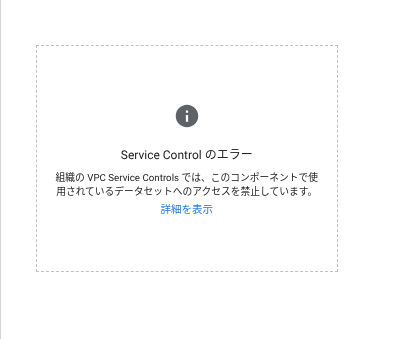 許可されていない IP アドレスからレポートを表示すると、Service Control のエラーが表示され、データは表示されません。 なお、VPC SC の適用を確認するには、データの更新など、Looker Studio から BigQuery に対してクエリが発行される操作を実行してください。