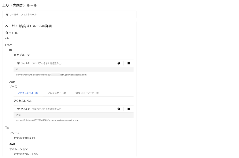 looker-studio-sa@<プロジェクト ID>.iam.gserviceaccount.comを ID として設定します。 - 「ソース」のアクセスレベルで、許可する IP アドレスを設定します。